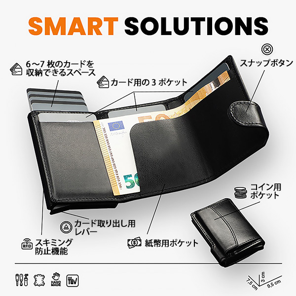 6-7枚のカード収納スペース+内側に3つのカードポケット、紙幣用スペース(5-6枚収納可)、外側に小銭入れ付。