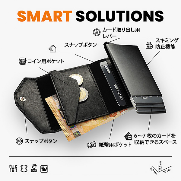 ボタンをスライドするとカードが並んで立ち上がり、欲しいカードをすぐに取り出せます。スキミング防止機能により、機密データやクレジットカードの不正読み取りを防ぎます。